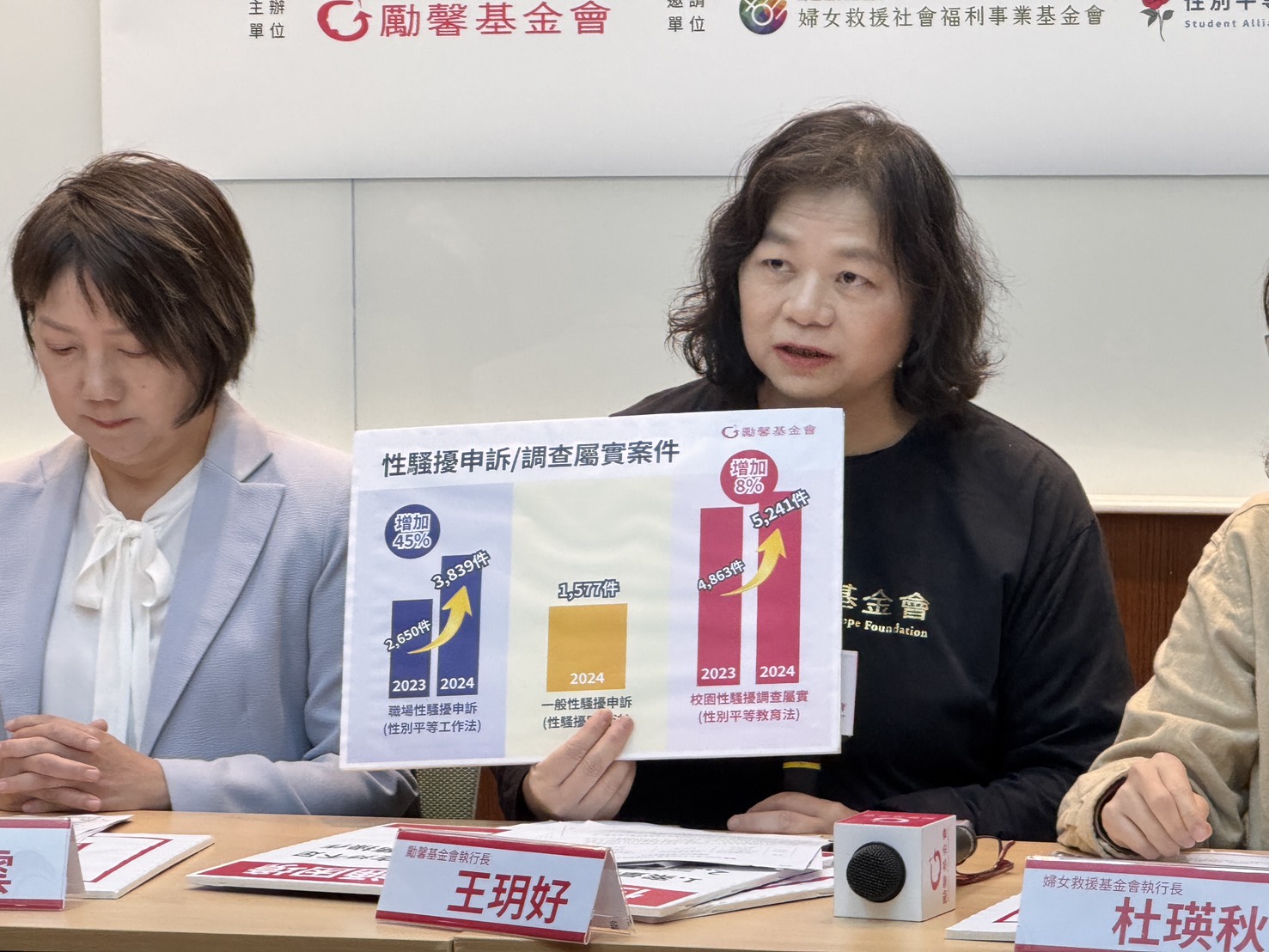 勵馨基金會執行長王玥好表示,性平三法自2024年3月8日正式施行後,整體申訴量明顯增加。一般性騷擾申訴案件由2023年的2,650件增至2024年的3,839件,成長約45%;校園性騷擾調查屬實案件由4,863件增至5,241件,平均每萬名學生約有12人遭遇性騷擾;職場性騷擾專章2024年上路後,當年即有1,577件申訴紀錄,全年全台性騷擾案件總數已突破一萬件。